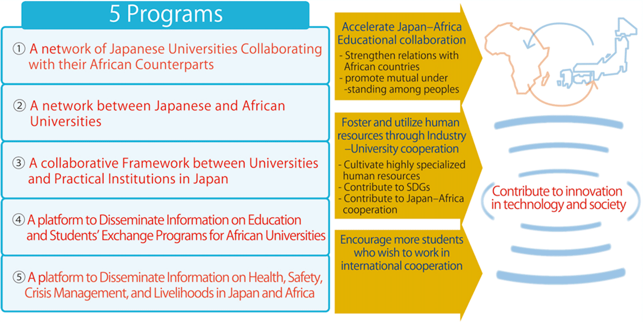 The university educational exchange between Japan and Africa is underdeveloped. There are several reasons for this: collaborations between Japanese universities are far from satisfactory; information regarding Japanese and African universities is not mutually accessible; and university students and teachers on both the sides face difficulties in accessing useful information regarding the studies in either Japan or Africa, as well as the students’ expected career design.